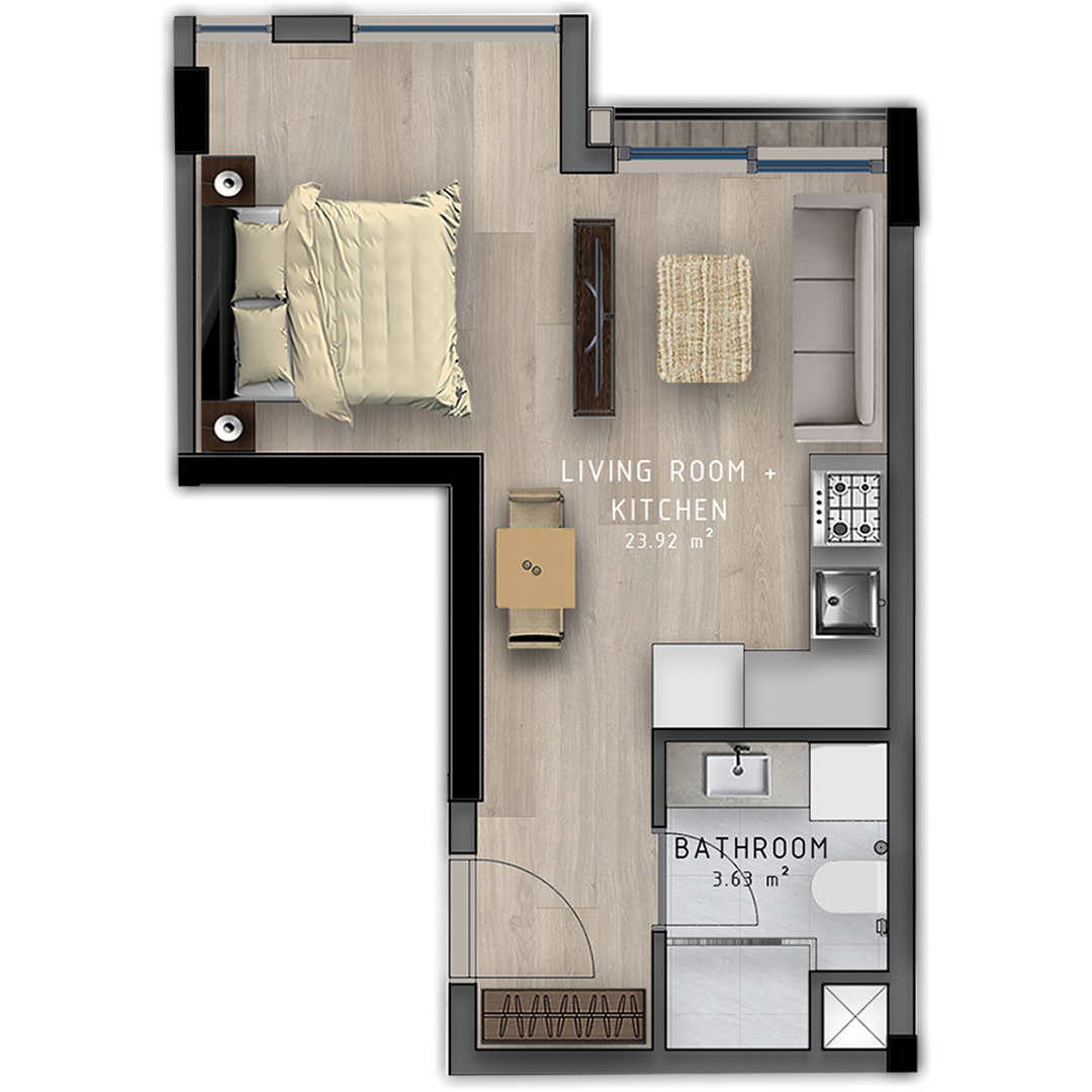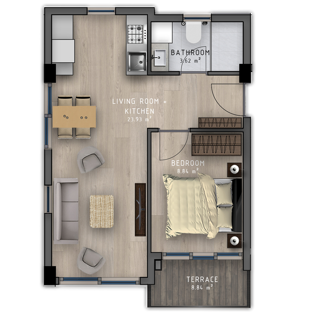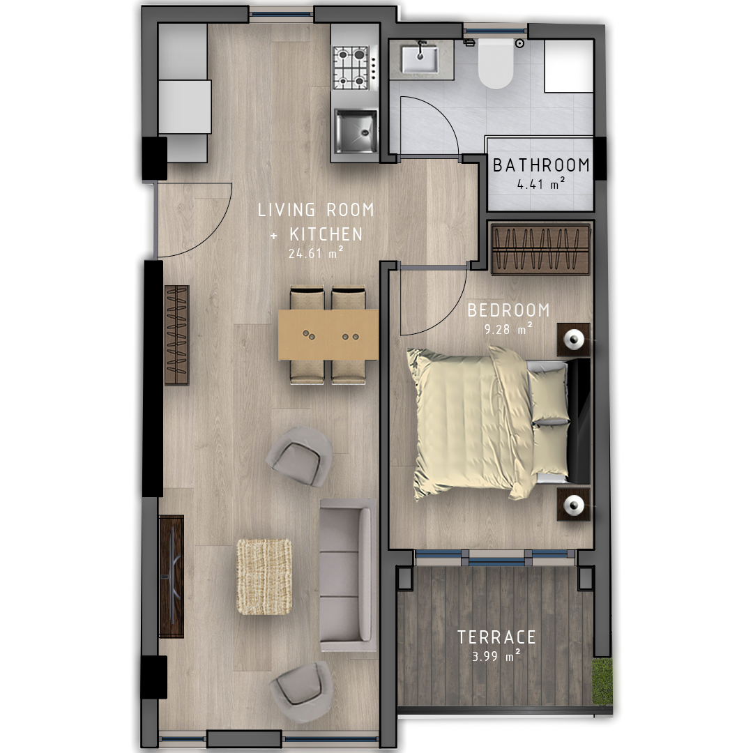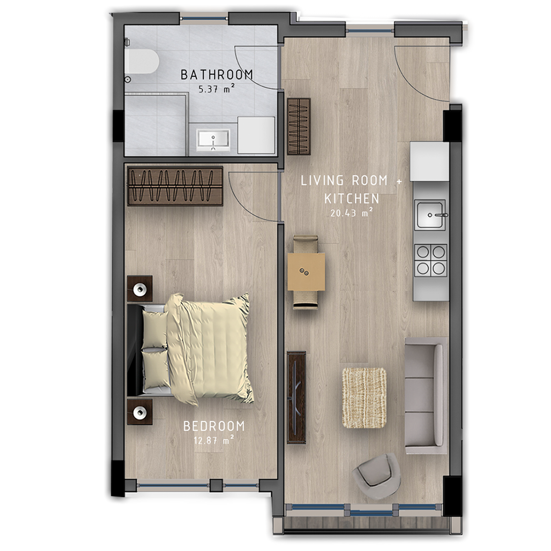 - 1+1 apartments are presented in 5 different types, all our consumers can choice any of those.