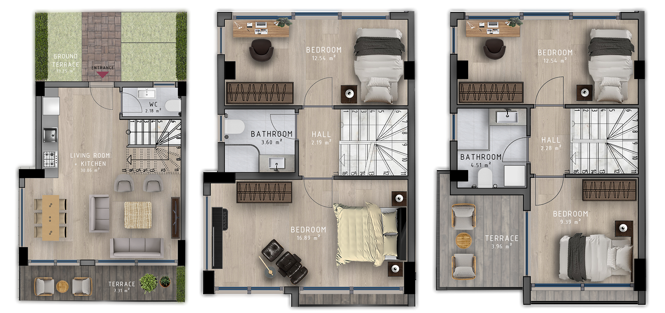 Duplex apartments with 2 bedrooms in one floor and combined saloon with kitchen in the second floor.